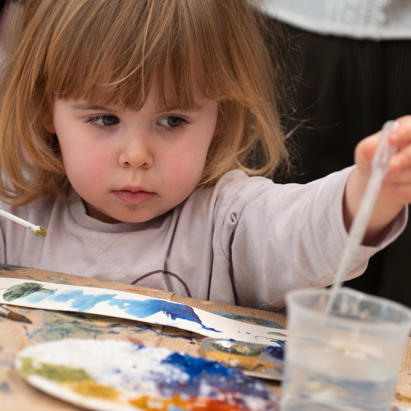 Inside the Clore Art Studio, the session is designed to promote curiosity and holistic learning through open-ended, sensory and creative possibilities.