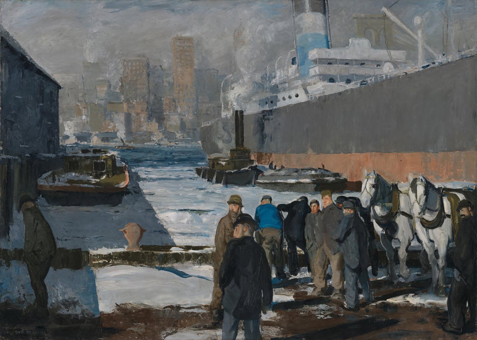 Ordinary people were the focus of the Ashcan painters of which Bellows was one, a political group of artists who were concerned to reveal the contrast between the haves and the have-nots. Bellows painted this from sketches he made on the Dock side, documenting the reality of the harsh existence of manual workers. We know he made this painting in January and February of 1912 and ensured it was exhibited in the March and April of that year, in the prestigious National Academy of Design. His interest in ships and shipping were fueled by the hysteria of the impending arrival of the Titanic, supposedly the most luxurious, decadent celebration of opulent life, due to dock in New York on the 15 April. It was a spectacle of luxury that contrasted powerfully with the grim and brutal existence of the workers, who were driving the burgeoning economy and the great capitalist American dream.