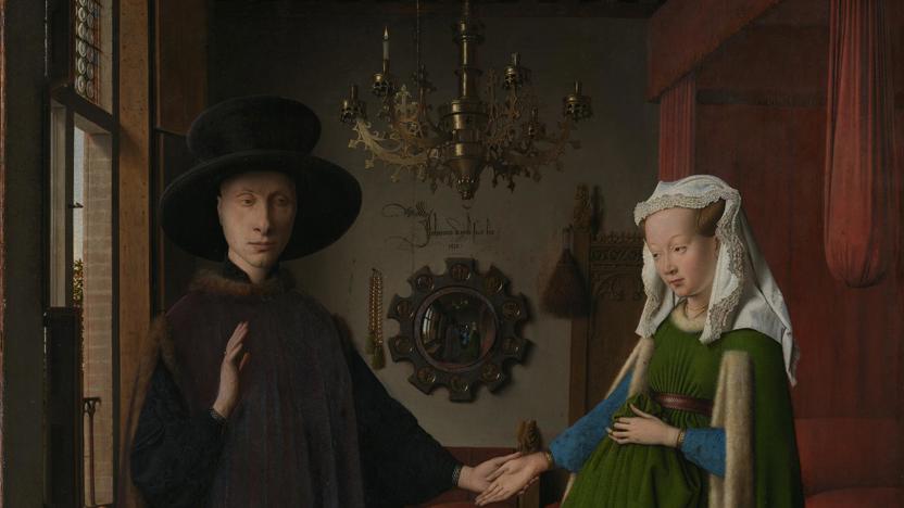 This is a description of 'The Arnolfini Portrait', by Jan van Eyck, painted in 1434. It is 82 centimetres high by 60 centimetres wide, painted in oils onto an oak panel, with a dark brown frame. Featuring astonishing detail, it was one of the earliest paintings in Western Europe to show off the ability of oil paint to create realistic depictions of objects and people.