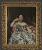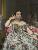 Her dress is a crinoline, the latest fashion in 1856, the skirt supported by voluminous petticoats which allow us no sense of the form of her legs beneath. The bodice is embellished with tassels and a bow with long trailing ribbons. The silvery coloured silk is patterned with flowers in blues, oranges and shades of red and pink, colours which are picked up throughout the painting, including on her fan. She has a large brooch on her bodice, and heavy bracelets on her wrists, all with huge stones in gold settings.