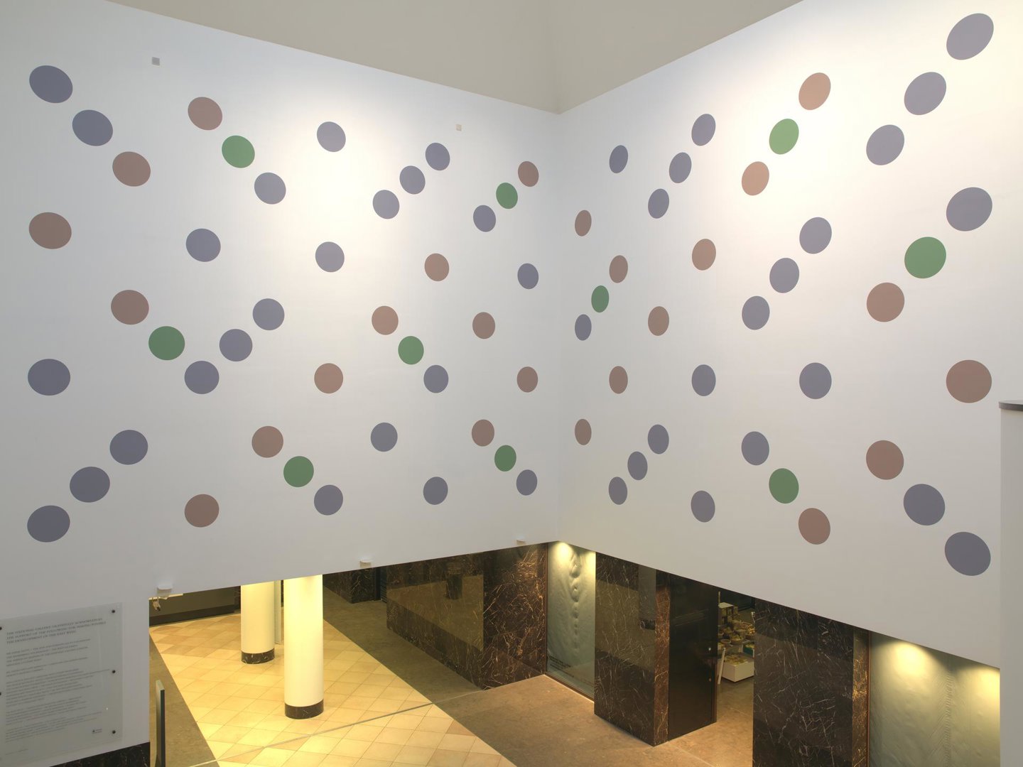 This enormous painting (across two walls here at the Gallery) is by Bridget Riley, whose works often involve collaboration.