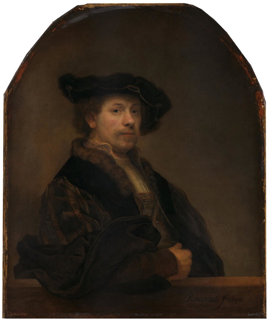 This is a description of Rembrandt’s Self Portrait at the Age of 34. It is oil on canvas and was painted in 1640. It is 90cm high and 75 wide. The work is presented in a gilt frame with a rounded arch at the top that encloses the painted figure. The Dutch master has depicted himself from the waist up, richly dressed and leaning on a stone ledge which runs along the bottom of the painting. His stocky body is turned to the right, but his head is angled towards us. His gaze is confident and direct. His left arm is hidden, but his right is placed firmly on the ledge, his elbow protruding towards us and his loosely clenched fist rests against his stomach. Rembrandt is clothed in velvet and fur and wears a shapely dark velvet hat with a flat top and a stiff, folded back brim. In this work, Rembrandt’s brushstrokes are smooth and meticulous. He predominantly uses brown, black and cream tones, creating a warm, atmospheric, and dimly lit painting. The source of light is defused through the painting, softly illuminating the artist from the right side of his face. His face is round and pale, with ruddy cheeks and wispy brown facial hair. He has a bulbus nose, intense dark grey eyes and red lips that are firmly pressed together. The Dutch artist pays careful attention to how the light illuminates his skin, showing us his imperfections and the early signs of aging. He created this self-portrait in Amsterdam, at a successful point in his career, when he was considered the go-to portraitist in The Netherlands. This work reflects his high status not only through his self-