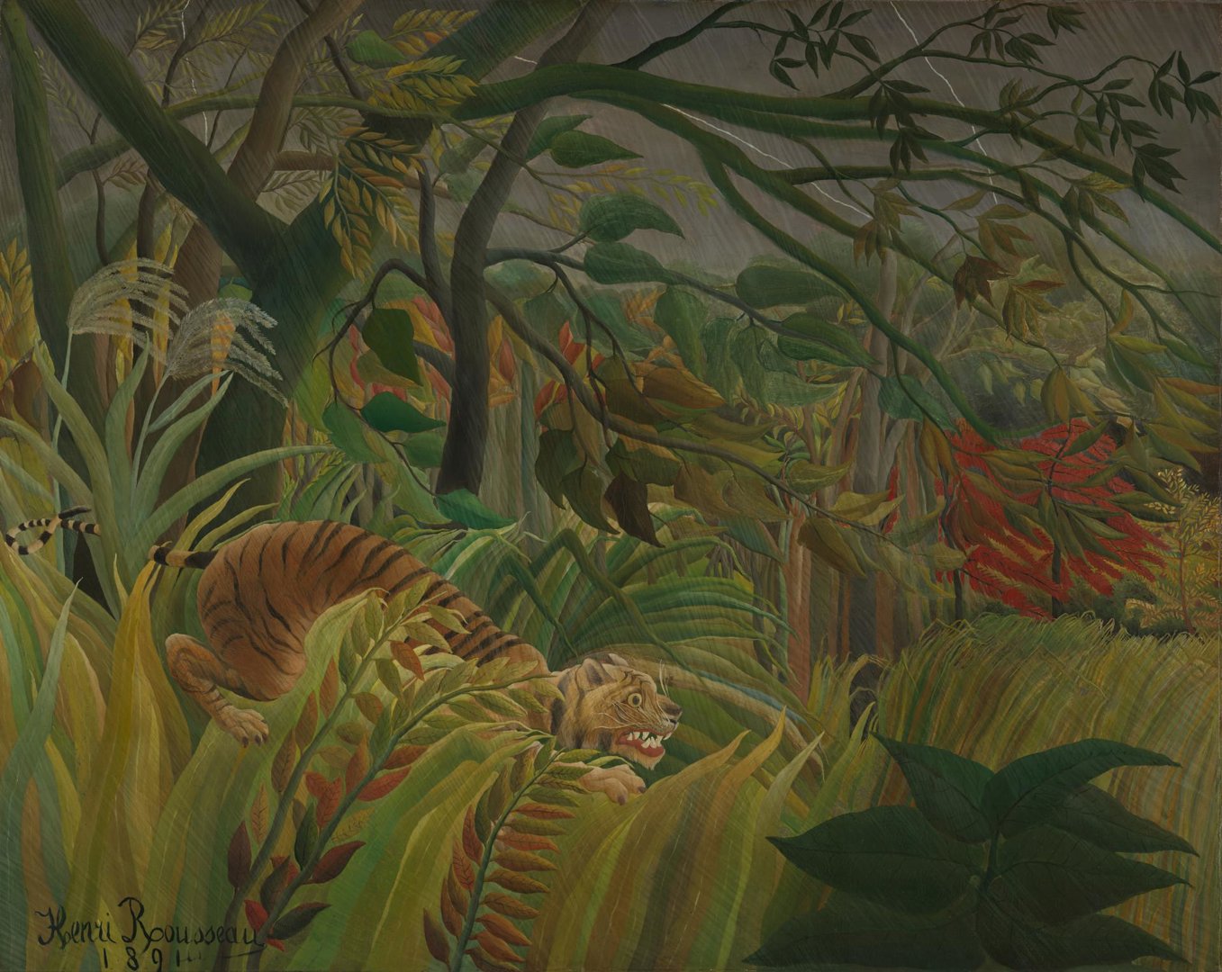 Is the tiger about to ‘surprise’ its prey? Or is the tiger in the moment surprised by the lightening and the loud thunderclap that we imagine emanating from it? The ambiguity adds an element of mystery to the painting, which may well have been Rousseau’s intention.