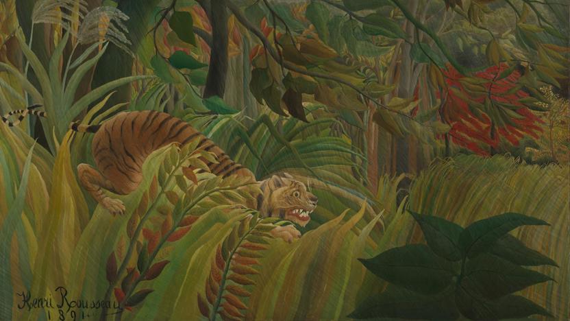 This is a detailed visual description of the painting ‘Surprised!’ by the French artist Henri Rousseau. It will take about 8 minutes to listen to and includes information about the scene depicted and the collage of ideas and resources that the artist used to create it.