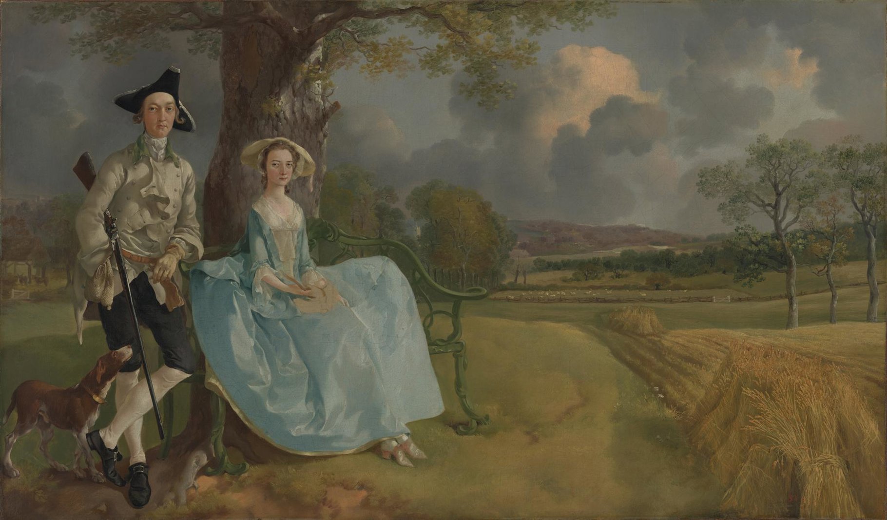 The painting is set on a country estate in the southern English countryside, near Sudbury in Suffolk. Mr Robert Andrews and his wife Frances are the main focus, but the composition is unusual, as they are positioned on the far left. The rest of the painting to the right shows the surrounding landscape. It is a triple portrait: husband and wife, and their land. Behind the couple looms a majestic oak, which is still alive and well today.
